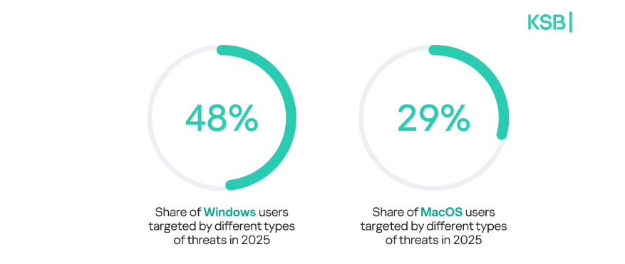 Windows系统仍是网络攻击的主要目标。2025年全年,48%的Windows用户遭受了不同类型的威胁攻击。而Mac用户遭受攻击的比例为29%。