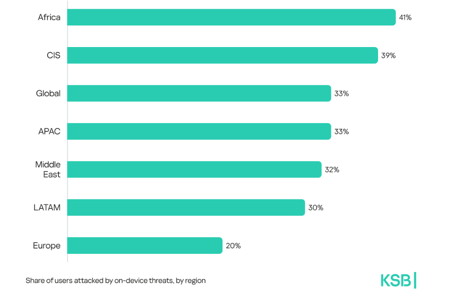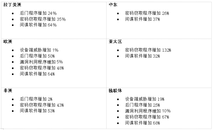 33%的用户遭遇了设备端威胁攻击。这些威胁包括通过可移动USB驱动器、CD和DVD传播的恶意软件,或以非开放形式初始侵入计算机的恶意软件(例如复杂安装程序中的程序、加密文件等)。