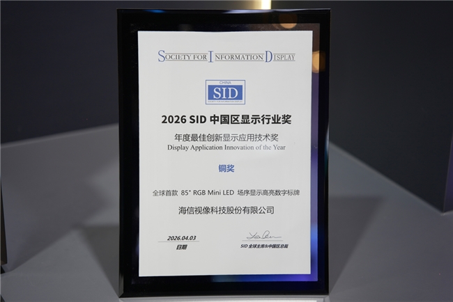 近日,2026年国际显示技术大会(ICDT)在重庆举办。海信凭借显示领域的突破性创新,一举斩获三项重磅大奖,包括全球首创的RGB-Mini LED技术入选“中国显示行业十大突破性进展”奖,成为近十年*获得重大突破奖的大屏液晶显示技术,全球首款玲珑4芯真彩背光RGB-Mini LED电视116UX荣膺“年度*佳显示应用产品金奖”,全球首款85吋RGB-Mini LED场序显示高亮数字标牌斩获“年度*佳创新显示应用技术奖”。
